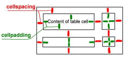 Cellpadding and Cellspacing Attribute of table: Using cellspacing you can set the space between cells and of the table and by using cellpadding you can set the space between cell the border and cell contents.