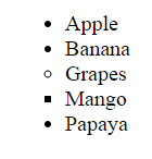 disc (with a filled circle). But you can modify the type attribute that specifies the style of the bullet point of a list item in a list. To modify it you can use the
