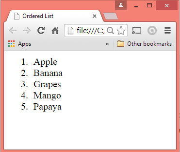 Ordered List: An ordered list is used to group a set of related items, in a specific format. An ordered list is a list where each item in the list is numbered. To create an ordered list we use an <ol> element and each item in the list is placed between an opening <li> and closing </li>. Here li stands for list item. Instead of <ul> if we use an <ol> then instead of bullets we will get a number. The browser indents the list content by default.