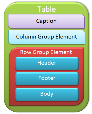 - Row Groups: <thead> is used to define the group of rows that have headings of the table. <tbody> is used to define a group of rows that have some data. <tfoot> is used to define the rows that have the footer data of the table.
