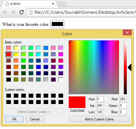Color: The color input type is quite self-explanatory, it allows users to select the color. When the user selects a color then it returns the hex value of the color. This color input type is the same as a color picker; we can use this to pick the color.