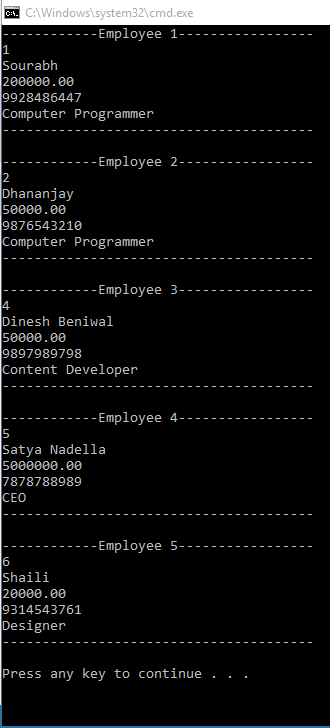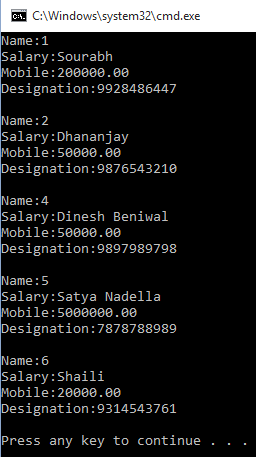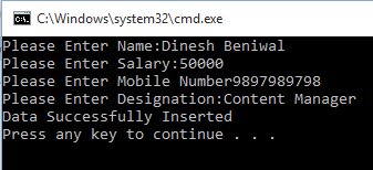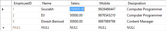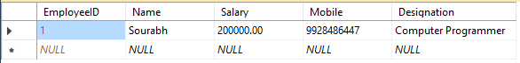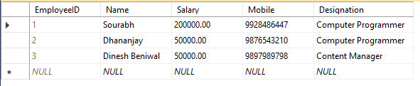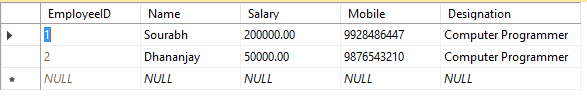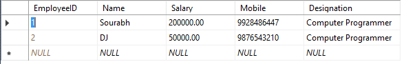 - SQLCommand = ("INSERT INTO EmployeeMaster(Name, Salary, Mobile, Designation) VALUES ('Sourabh','200000','9928486447','Computer Programmer')")