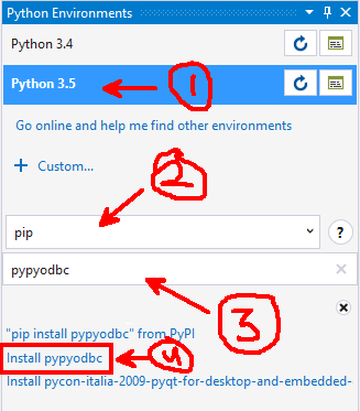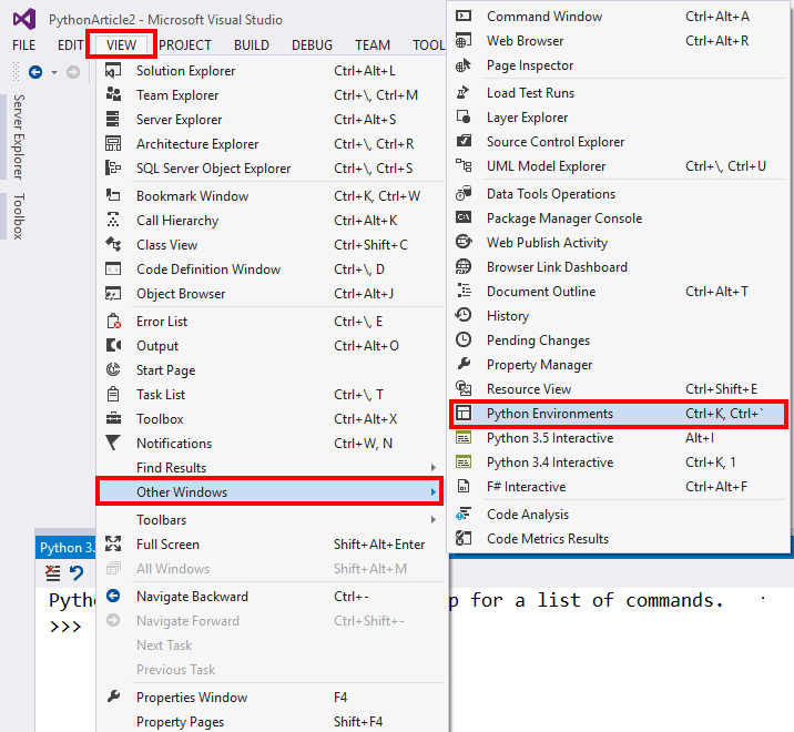 - Open Python Environment in Visual Studio by clicking VIEW, Other Windows, then Python Environment.