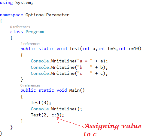- public static void Test(int a,int b=5,int c=10)
