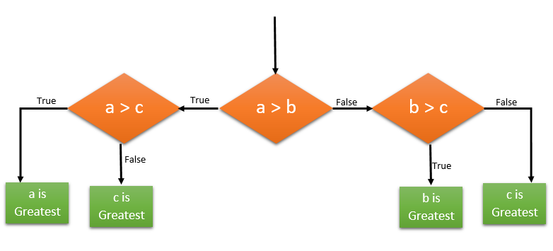 In this example I am combining nested if and elif together in a simple example. Suppose we have a problem. We want to find out greatest number among 3 numbers.