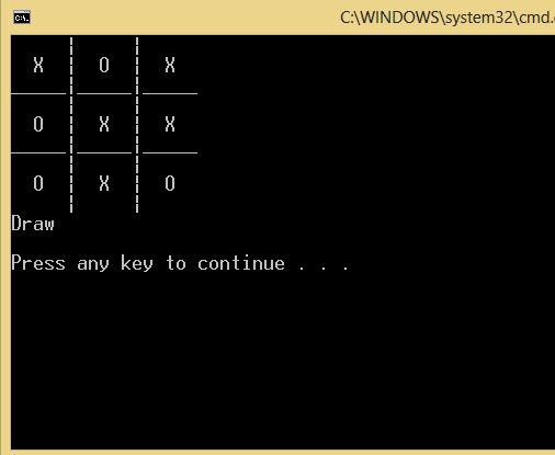 - If the game is a draw or all places are filled with Xs and Os and no winning condition is satisfied then the output will be like: