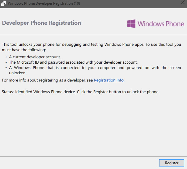 You only need to have your phone connected via USB, screen unlocked and with internet connectivity. Then just hit "Register" button. the app will ask you for your LiveID account and the phone will be registered for development.