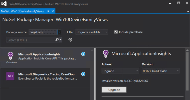 One of the results will be "Microsoft.ApplicationInsights". Select it and click Upgrade in the button at the right. Now in the Filter dropdown select "All" again and search for the following packages: