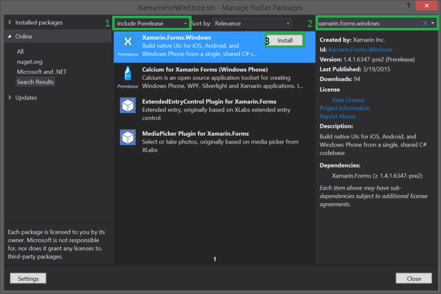 Now, you need to add the Xamarin.Forms NuGet to your new Windows Universal project. Just like before, right-click on the solution and open the NuGet manager for the solution. Select the Online node in the left side tree, be sure the channel is established in "Include prerelease" and search for Xamarin.forms.windows as in the following: