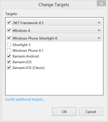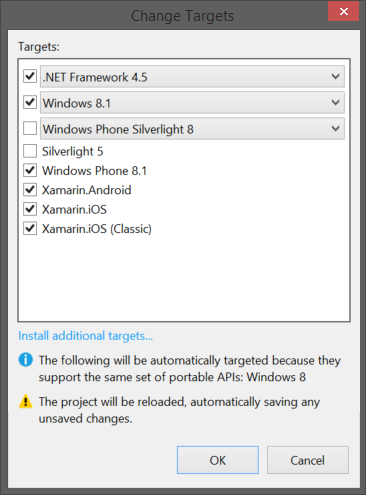Now you have the libraries needed in your Universal project so it can support Xamarin.Forms. Now you need to add a reference to your Universal project for the Xamarin.Forms portable class library with our shared code and views. The problem is, by default Xamarin.Forms created PCL doesn't support Windows Phone 8.1 or Windows Store: