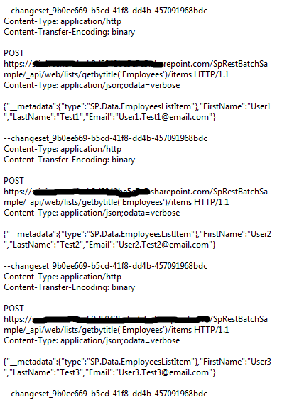 SharePoint provides $batch processing that requires the following code snippet to generate the data shown in the preceding format. The following code is attached with this article as RESTAPI_Batch.js.
