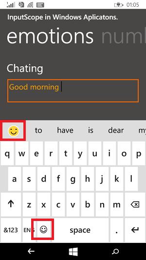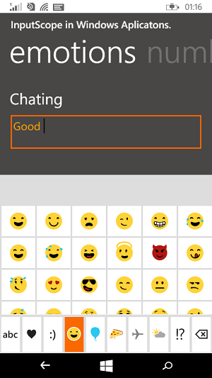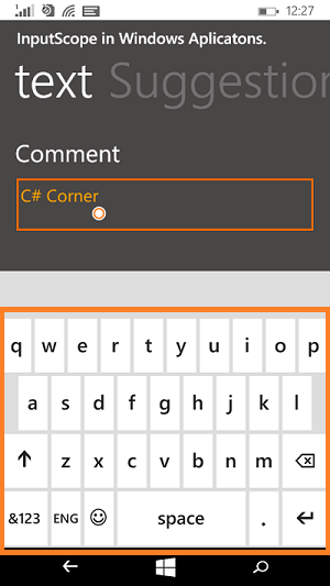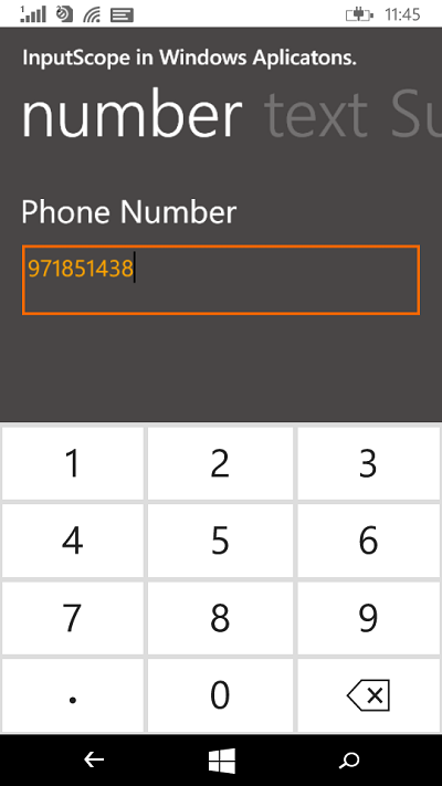 txtInputNumber is the ID of TextBox control. So either we can set the input scope at xaml or programmatically. Now let's see about the another type: Text