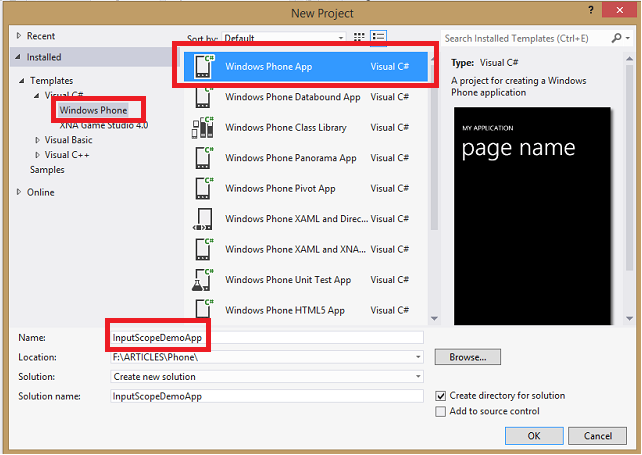 Windows Phone". After that select "Windows Phone App" form the listed template.