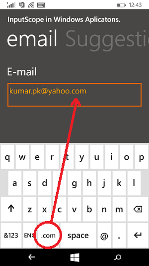 As we read above, InputScope is a property of TextBox control which is used to control the keyboards type using the different values of InputScope. For example, we may use Numeric Keyboard only if we only need to input number in a textbox or we may use e-mail supported keyboard if we only need to input email address which provides easiest way to access symbol @.