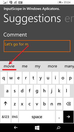If we use search as a InputScope for a TextBox, it provide the facilities for word suggestion at the time of typing. Suppose we have to type programming, so if we are using this keyboard type as we type pro or prog or progr it will display some suggestions just above the keyboard as programming, progra, any word which start with the word that you have typed yet.