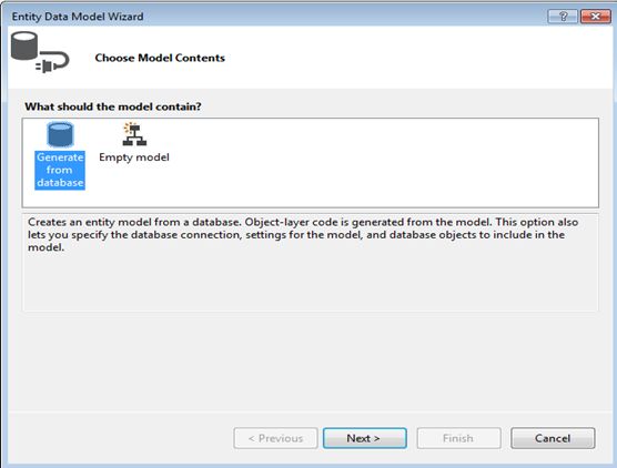 - Generate from database: this option means create an entity model from an existing database schema. If we already have a database ready then we use this option.