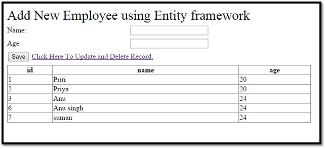 Using this screen we can add a new employee to our database table using Entity Framework and display all the employee records. We need to add a line of code for adding records to the database. Add this code on button click event.