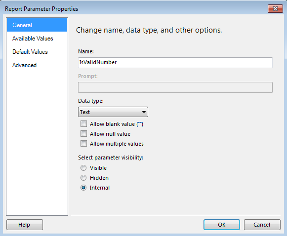 Step 2Then we need to create one parameter, IsValidNumber, whose datatype should be Text and the visibility of the parameter should be Internal.