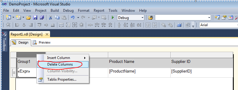 Step 3: Go to Tablix and right-click on the Group1 column that is automatically created when we create a group. Then select Delete Columns.