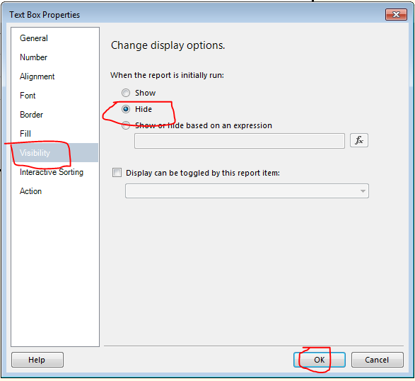 Select the Visibility option from the TextBox properties window and then select the Hide option form the visibility tab.