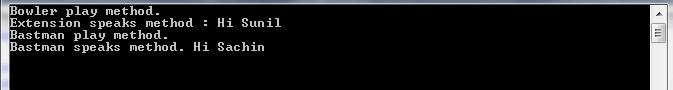 Arrgh! The result seems a bit strange for the Bowler class. It calls an extension method whereas for Batsman it calls the method defined in the class. So why is it like that? It is because at compile time, extension methods always have a lower priority than instance methods defined in the type itself. If you are coming from a JavaScript programming background then you can quickly correlate it with a prototype property of a function. So you can't use extension methods to override the class.