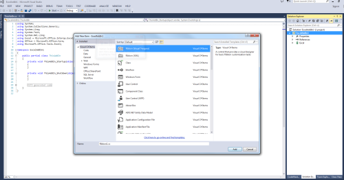 - To insert a Ribbon Designer, select the created project in the Solution Explorer and go to:
