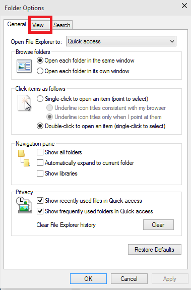 - After clicking the Options, the Folder Options dialog box will be visible.