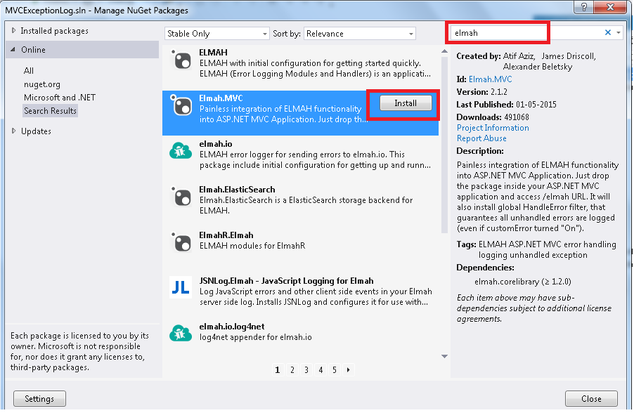 Right click on project solution go to Manage NuGetPackages for Solution, click on it and search elmah and install it,