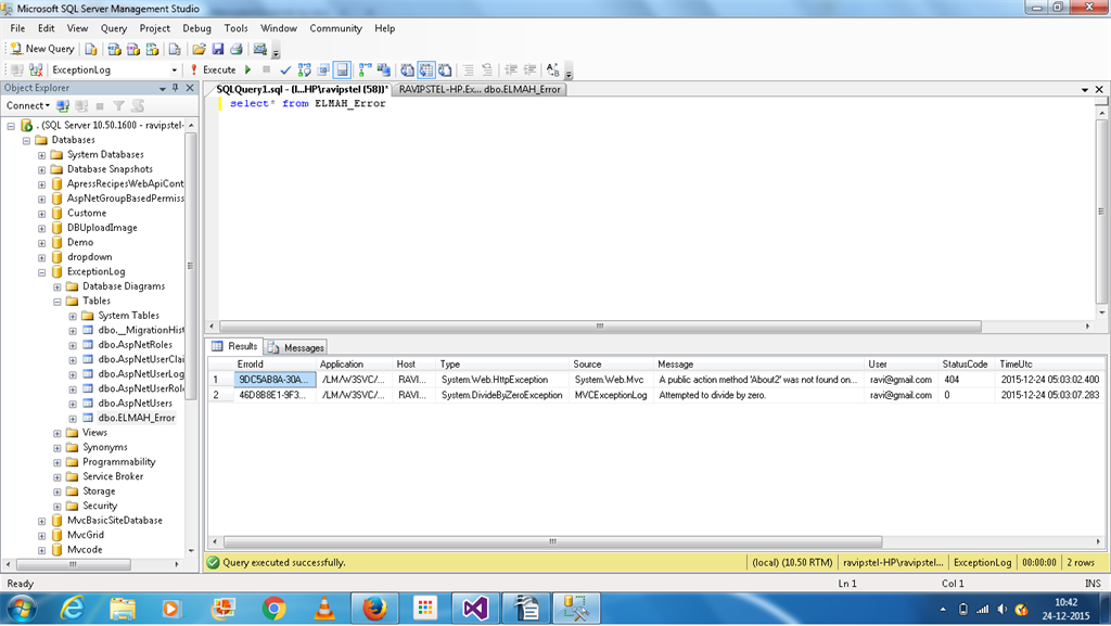 Here I am using SQL Server database to log the exception. I have already created database SQL Server named ExceptionLog. Open SQL Server Management Studio, run the following code in ExceptionLog database one by one.
