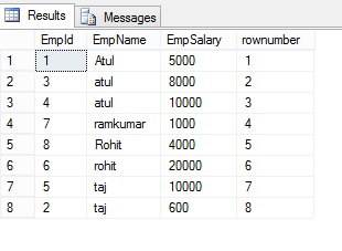 - Select *, ROW_NUMBER() over(partition by Empname order by Empname ) as rownumber from Employe