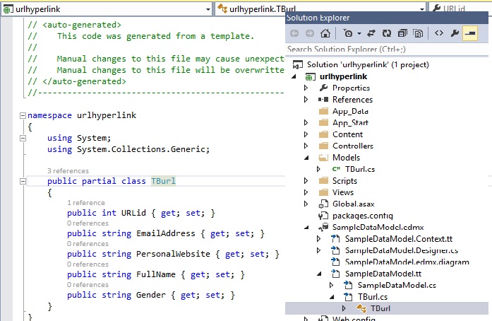 In the above code I am created partial class with name TBurl, and I have same class inside our sampleDtataModel that is created automatically if I am using entity Framework using wizard. In this class I am not adding model validation, since in future if I want to override the table inside sampleDtataModel, all the validations in the class will lost. This is the reason we need to create partial class here.