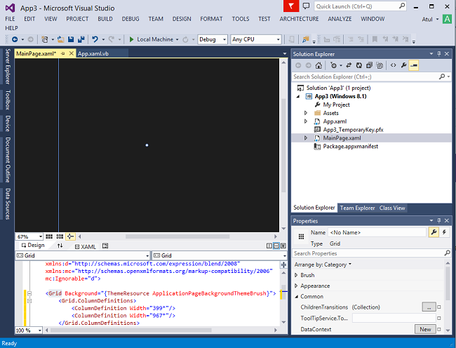 These files are essential to all Windows Store apps using Visual Basic or C#. Any Windows Store app project that you create in Visual Studio contains them. Let us see the home windows of a Blank App (Windows). If you double-click on the Main Page you get the following window.