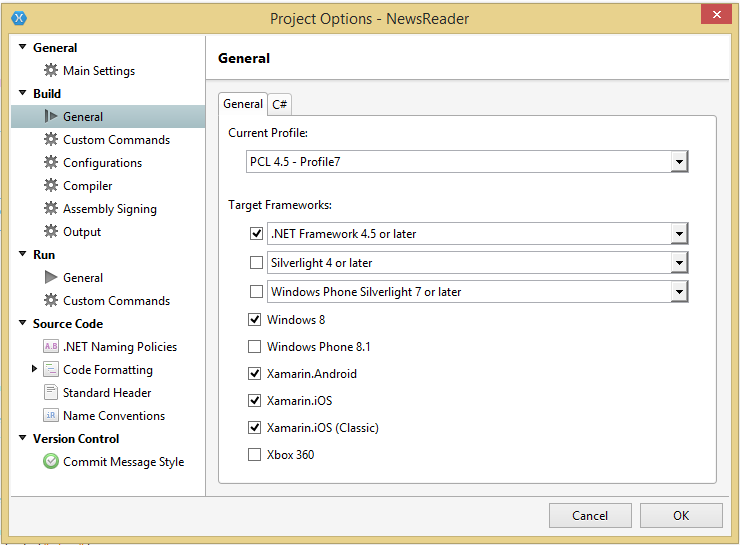 Let's fire up our Xamarin studio and create a portable class library named NewsReader.cs. After you are done creating the project, delete the MyClass.cs file that has been created and right-click on the project name to go over the options. Move to the General section under build and you'll see the PCL profile you are using. I'm currently using the PCL profile 72 that targets .Net 4.5, Windows 8, Xamarin.Android and Xamarin.iOS.