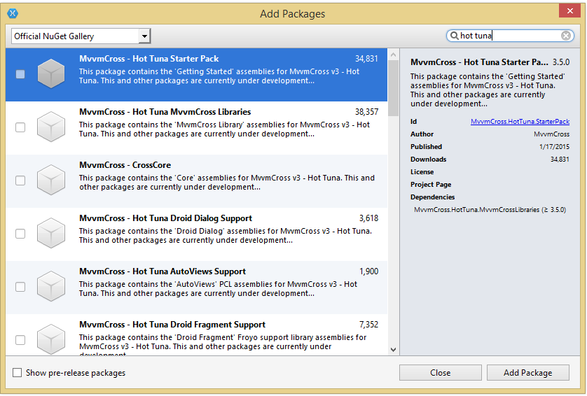 Now, let's move on and install mvvmcross. To do that, all we need to do is right-click on the project name, Add -> Add nuget packages and you can select over all the Nuget packages available for use. We will install the MvvmCross - Hot Tuna Started Pack. Make it sure that you are downloading the latest stable version. Im using 3.5.0 here.