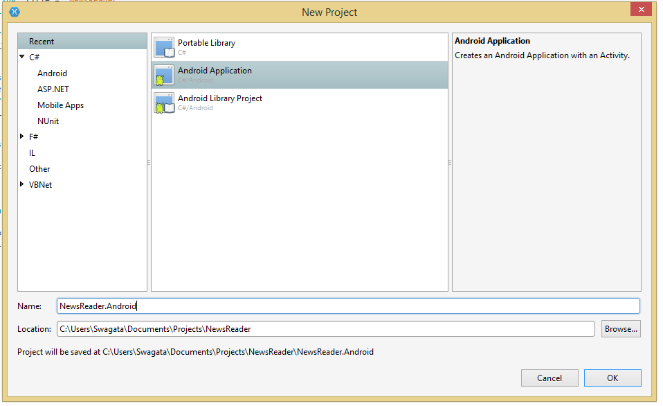 Looks like we are all set with our very very very simple PCL. Now, let's add a new project to the solution. And it's going to be an Android project. Let's name it NewsReader.Android.