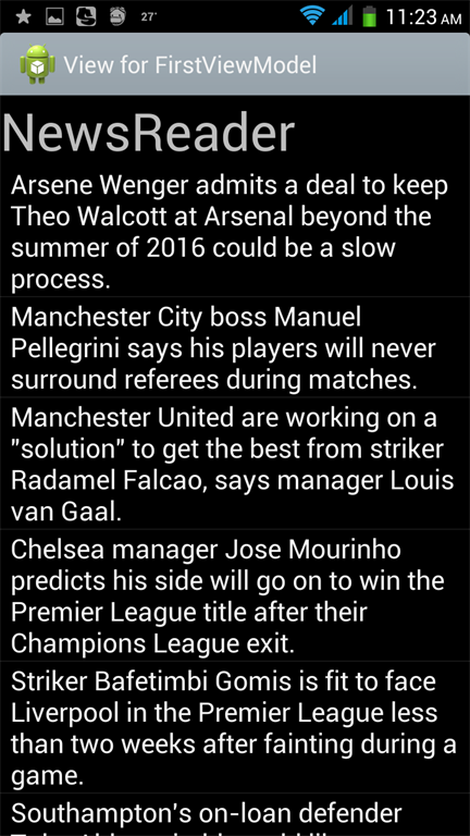 Now, if you remember we had two properties exposed from our ViewModel. One were Title and the other were NewsCollection. For the title we used TextView, for all the XAMLites out there, TextView is just like TextBlock in Windows Phone. And if you look closely we bound local:MvxBind to the property we wanted to bind from our ViewModel. Now you might ask how MvxBind works here, it looks definitely a bit different from the ones we had in XAML. Now if you look closely, the first binding statement is "Text Title". That means we are binding the android:text property of the TextView with the Title property that has been exposed from our ViewModel.