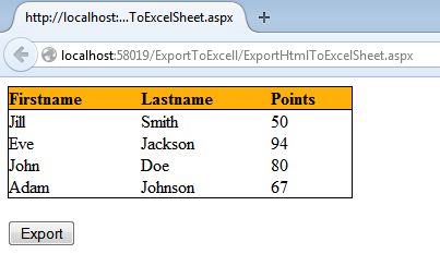 1. Export HTML table content to Excel sheetI have created the following simple HTML table.When I click on the export button, my exported Excel sheet will be:Code