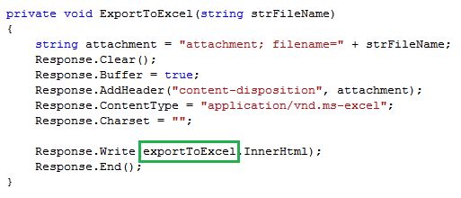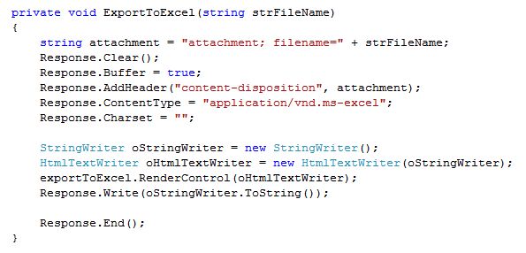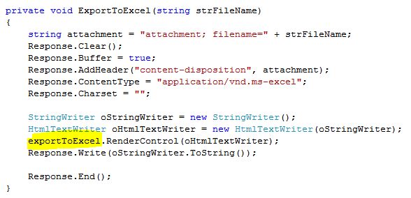 Here I will show how to export a HTML table, grid view controls and image control to Excel sheet.Download the source code for more details.This article will help explain the following points: