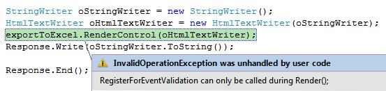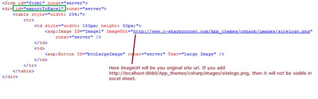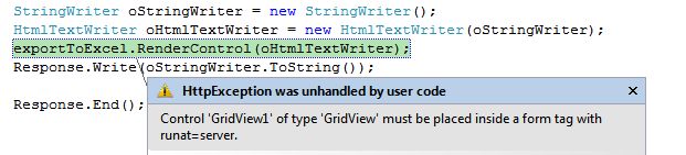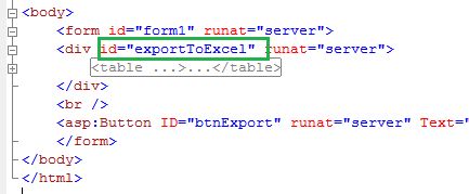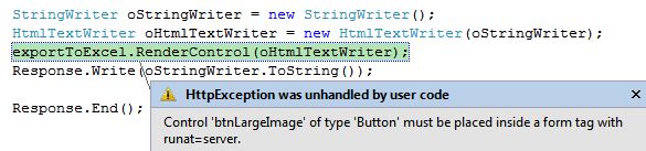 3. Export server-side controls and image to Excel sheetI have created an image and a button and I need to export these to an Excel sheet.When I click on the export button, I will get the following error:To fix this error, add the following function:When you click again on the export button, you will get the following error:This error has occurred because of the “button” control. To fix this error, add the following attribute:Final output:Code: