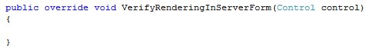 Note: If the table has a CSS class then that CSS class design will not be exported to the Excel sheet.2. Export Grid View to Excel sheetI have created the following simple Grandview.When I click on the export button, I will get the following error.To fix this error, add the following function.Final output:Code