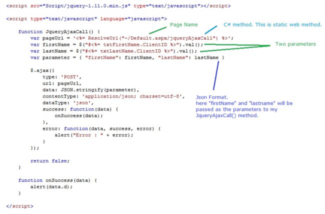 I will use the jQuery.ajax() or $.ajax() method to call the C# method (WebMethod). The $.ajax() method does an asynchronous HTTP (Ajax) request. This method will take various parameters. So you will get the entire parameters list in a link: https://api.jquery.com/jQuery.ajax/
