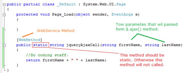 - Here I declared the C# method as WebMethod and it should be static.