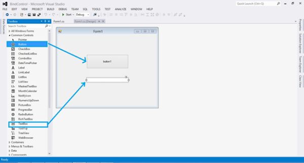 - Drag and drop controls, like a TextBox and a Button, onto the form.