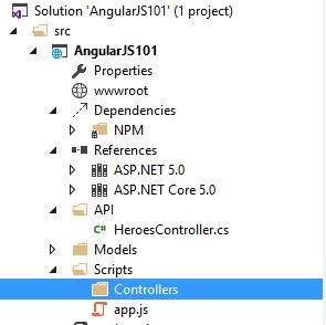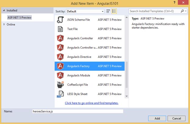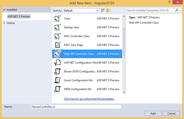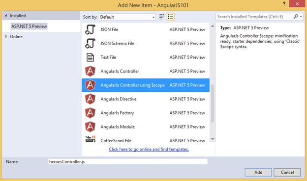 Visual Studio 2015 includes templates for creating AngularJs modules, controllers, directives and factories. For this example we will be displaying the list of heroes using an AngularJs template.