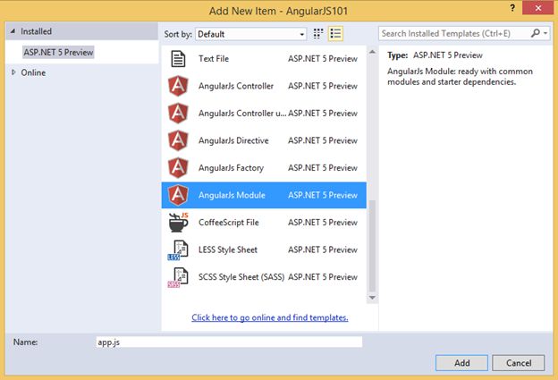 Click Add to generate the file and copy the following code for our AngularJs module: