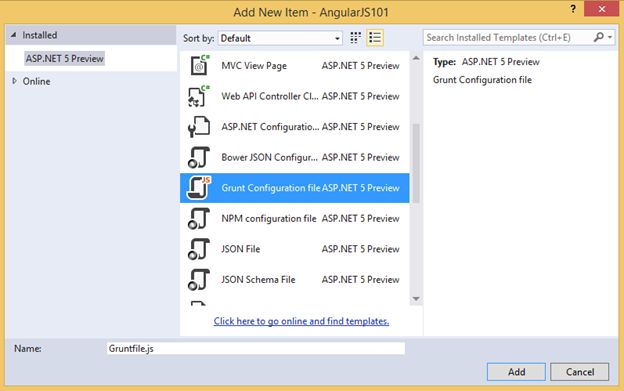 Now right-click on your project and select Add > New Item. Select Grunt Configuration file from the dialog as shown in the figure below: