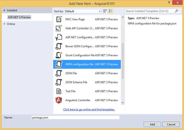 For this example we need to use NPM to install the resources we need in our application such as Grunt and the Grunt plugins. To do this just right-click in the Project (in this case AngularJS101) and select Add > New Item. In the dialog select NPM configuration file as shown in the figure below: