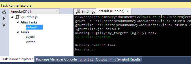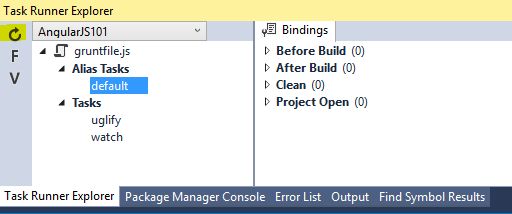 Now save the file and let's run the Grunt file using Visual Studio Task Runner Explorer. To do this, go to View > Other Windows > Task Runner Explorer in Visual Studio main menu. In the Task Runner Explorer be sure to hit the refresh button to load the tasks for our application. You should see something like this: