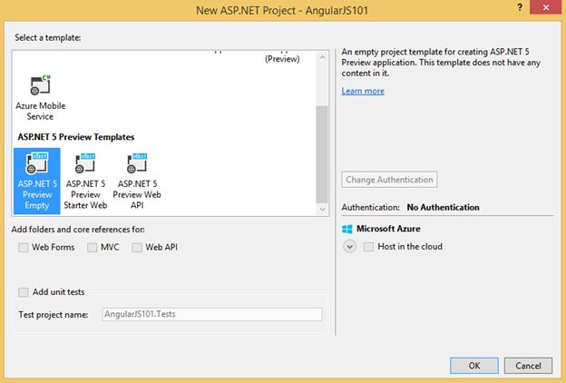 Name your project to whatever you like and then click OK. For the example I named the project as “AngularJS101”. Now after that you should be able to see the “New ASP.NET Project” dialog: