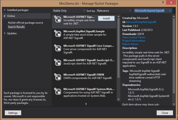 Under the Visual Studio Tools tab, select Library Package Manager > Manage Nuget Package for the solution. In the search bar type “Microsoft.Aspnet.SignalR” and hit Enter. The result should provide you something as in the following.